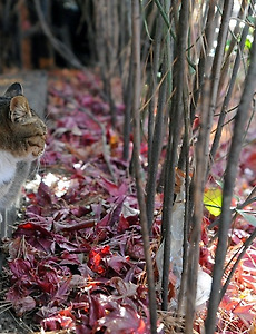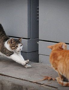 길고양이 아줌마, 둘이라서 좋아요 노랑아줌마 혼자서 단풍 깔린 길을 걸어봅니다. 호젓하게 걷는다고 좋아하기엔 왠지 마음이 쓸쓸해지는 겨울이라 그런지, 노랑아줌마의 눈길도 자꾸만 인기척이 느껴지는 뒤쪽을 향합니다. 이럴 때는 함께 낙엽 바삭거리며 걸어주고 수다도 떨어줄 이웃이 제격이니까요. 헛헛한 노랑아줌마의 마음을 눈치챘다다는 듯, 카오스 대장냥이 슬며서 다가섭니다. 여름에 볼 때와는 달리 카오스 대장과 노랑아줌마의 얼굴에도 살집이 도톰하게 생겼습니다. 겨울 날 차비를 몸이 먼저 하는 것이겠지요. "이 아줌마가, 쑥쓰럽게 얼굴은 왜 이렇게 가까이 들이밀고 그래." "아유, 우리 사이에 내외할 거 있수. 말을 트려면 냄새는 맡아야지." 둘이 다정하게 얼굴을 갖다댑니다. 둘 다 아줌마라는 것을 알고 있기에 호젓한 단풍길에 로맨스가 끼어들 일.. 2010. 12. 20. 햇볕에 몸을 데우는 길고양이 이제 가을의 흔적은 모두 사라지고 바싹 말라버린 낙엽더미만 남아있으려니 하고 생각했지만, 12월로 접어든 요즘도 누렇게 변해버린 나뭇잎 사이로 붉은 기를 담은 단풍잎이 보입니다. 마른 단풍잎 색깔은 다 같을 것이라 생각했는데, 어떤 것은 잿빛을 띤 분홍색이고, 어떤 것은 붉은색이 말라붙은 듯한 검붉은색, 어떤 것은 붉은 기를 다 토해내고 갈색으로 변해갑니다. 고양이 털옷이 저마다 다른 색을 담은 것처럼, 밀레니엄 고양이가 은신처로 삼은 이곳의 단풍잎도 고양이 옷을 닮아가나 봅니다. 아직 남아있는 붉은색의 온기만큼, 단풍잎 한 장 한 장이 핫팩이 되어서 고양이의 차가운 몸을 뜨끈뜨끈 데워주면 좋으련만 그저 부질없는 상상에 그칠 뿐입니다. 어렸을 때 배운 차가운 색, 따뜻한 색을 보면서 했던 상상 중에 '따.. 2010. 12. 16. 길고양이와 집고양이, 한밤중의 만남 외출고양이로 사는 집고양이와 길고양이가 한밤중에 만났습니다. 집고양이는 "너 황소? 나 최영의야!" 하고 대사를 치는 송강호의 기세로 뚜벅뚜벅 걸어옵니다. 아직 어린 노랑둥이 길고양이는 뒷모습만 보여서 얼굴 표정을 읽을 수는 없지만, 긴장과 호기심이 교차하는지 그 자리에 가만히 서서 집고양이가 다가올 때까지 기다립니다. 도망은 가지 않지만, 그래도 긴장감을 감출 수 없었는지 꼬리가 너구리 꼬리처럼 두껍고 크게 부풀어올랐습니다. 그 사이에 집고양이는 어느새 코앞까지 뚜벅뚜벅 다가와 있습니다. 혹시 싸움이라도 한 판 벌이려는 걸까요. 궁금합니다. 그런데 집고양이의 표정이 그리 나쁘지 않습니다. 귀를 납작하게 내리고 눈매를 반달눈으로 뜨고는, 뭔가 설득하는 듯한 표정으로 어린 길고양이와 무언의 대화를 나눕니다.. 2010. 12. 8. 소외된 고양이 돕는 '2011 고양이 달력' 12월이 다가오면 '괜찮은 달력 없나?' 하고 두리번거리게 됩니다. 달력을 구매하거나 달력 그림을 관람하면서, 도움이 필요한 동물들을 도울 수도 있고, 길고양이에 대한 지식도 얻을 수 있는 2011년 고양이 달력들을 소개해 봅니다. 고양이를 좋아하는 분들이라면 마음에 쏙 드시리라 믿어요. 1. 2011년 마리캣 달력 고양이 작가 마리캣 님의 고양이 달력입니다. 아름다운 장식세밀화로 널리 알려진 작가의 멋진 그림들을 올해도 달력으로 만날 수 있습니다. * 사진으론 이 정도밖에 안 나오는 게 아쉽지만 실제로는 고양이 털 하나까지 섬세합니다. 12월 15일~21일까지 인사동 윤갤러리에서 열리는 전시회에는 2011년 달력 원화뿐 아니라 작가가 소장한 소품 및 고양이 아트상품 판매도 이뤄진다고 합니다. 전시 입장.. 2010. 12. 6. 단풍잎 융단을 만끽하는 고양이 둥글게 움츠린 고양이의 등짝이 어쩐지 추워보이는 계절이 돌아왔습니다. 이제 단풍이라곤 바닥에 떨어진 나뭇잎의 희미한 붉은색으로만 느낄 수 있을 따름입니다. 한때 붉게 물들었다 잿빛을 띤 분홍색으로 변하는 단풍잎은, 자신에게 주어진 시간을 있는 힘껏 불태우고 아무 미련 없이 이 세상과 작별하는 것 같습니다. 이 세상에 태어나 머물렀던 시간을 '소풍'이라고 표현했던 천상병 시인의 말처럼, 소풍 가던 날의 들뜬 마음을 접고 가만히 이 땅으로 내려앉은 낙엽들이 마른 땅에 따스한 융단을 만들어줍니다. 그 융단을 즐거이 이용해 주는 것은 동네 고양이입니다. 노란 치즈 얼룩무늬가 예쁜, 통통한 겨울 고양이입니다. 등산객의 인기척이 들려도 한번 힐끗 쳐다보기만 할 뿐, 담담한 표정으로 단풍잎 융단을 만끽합니다. 융단 .. 2010. 12. 3. 길고양이 기지개, 깜짝 놀랄 자세 작년 늦가을에 태어난 밀레니엄 고양이의 일족, 고동이는 무사히 1년을 버텨 당당한 어른 고양이가 되었습니다. 마치 고동색 망토를 등에 두른 것처럼, 어깨에서부터 등까지 고르게 멋진 점박이 고동색 무늬가 있는 고동이입니다. 그나저나 고동이 녀석, 기지개 한번 요란하게 하네요. 고양이를 모르는 사람이 보면 '나를 위협하는 건가?' 하고 깜짝 놀랄 만한 표정으로 무지 크게 하품까지 함께 합니다. 엉덩이를 쭉 빼고, 입은 힘껏 벌리고, 귀까지 뒤로 쫙 젖힌 걸 보니 저 기지개 한번이면 묵은 피로가 싹 달아날 것 같습니다. 참고로 고양이의 하품과 위협을 구분하는 방법을 말씀드리면, 진짜 위협할 