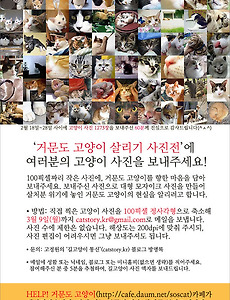 거문도 고양이 살리기 사진전을 위한 '100픽셀 프로젝트' 중간결산입니다. 2월 18일부터 28일까지, 60분께서 총 1273장의 고양이 사진을 보내주셨습니다^^ 3월 1일 이후 사진을 보낸 분들의 명단은 3월 9일 접수마감 후 정리해 올리겠습니다. 신지영, 정주혜, ♬, 김미라, 토란, 손지연, 송씨네, 케샤르, 멧돼지, 별나라전갈, 손정선, 아니스, 우승현, 이호영, 제프, 주하나, 천보배, 춘배, 포카리, 비공개님, 강경희, 김재희, 돌쇠엄마, 랑새, 박하로, 비단물소리, Fallen Angel , 이진주, 임선주, 뽀도르, 조헌탁, Njel, 아이스윈드, 김중경, 메이티, 성유진, 윤소정, 이혜리, 하나, 히스엄마, cean, 일하는곰, 김지혜, 랜디행복비쥬, 유향미, 추쿠♡, 기린초, 김세화, ..