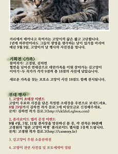 9월의 동물전시 '종합선물세트' 쏩니다 1300K , 텐바이텐, 바보사랑 판매중(사이트명 클릭하면 이동합니다^ㅅ^) 9월에는 동물 관련 행사와 기획전시가 유독 많이 열리네요. 그것도 모두 9월 초~중순에 몰려 있어서, 고양이를 좋아하는 사람들에게는 마치 종합선물세트 같습니다. 제2회 '고양이의 날' 행사 외에도 다양한 동물 관련 전시가 열리니 한번 들러보세요. * 성북동갤러리에서 열리는 '고양이의 날' 기념전시와 행사, 개막까지 딱 이틀 남았습니다. 행사 준비와 개인적으로 해야할 일이 겹쳐 며칠간 정신이 없네요. 그럼 전시 소식 쏩니다- 1. 제2회 고양이의 날 행사 및 전시(9월 4일~11일, 오후 2시~8시)-성북동갤러리 ♦ 주요 전시 및 행사 1. 기획전 기획전은 매년 한 가지 주제를 정해, 기획자와 초대작가가 함께 작품을 준비합니다. .. 2010. 9. 2. 제빵왕이 만든 '세상에서 제일 배부른 빵' 시식기 드라마를 자주 챙겨보지 못하는 편이지만, 빵을 좋아해서 '제빵왕 김탁구'에 나오는 빵은 한번쯤 먹어보고 싶은 생각이 듭니다. 특히 팔봉빵집의 1차 경합에서 탁구가 만든 '세상에서 가장 배부른 빵'은 옥수수와 보리밥으로 만들었다기에 한번쯤 먹어보고 싶었죠. 며칠 전 뚜레주르에서 '제빵왕이 만든 세상에서 제일 배부른 빵-우리밀 옥수수 보리빵'이 김탁구가 만든 빵과 비슷한 컨셉으로 출시되었다기에, 호기심이 생겨 한 개 사왔습니다. 크기는 생각보다 컸구요, 작은 통닭 한 마리 정도의 느낌이랄까요? 노릇노릇 잘 구워진 빵의 뒤태가 꼭 구이통닭의 엉덩이처럼 토실토실합니다. 껍질도 바삭바삭하니 고소하게 구워졌네요. 빵의 풍미를 느껴보기 위해 전자렌지에 살짝 돌려 따끈하게 한 다음 속살을 갈라봅니다. 탁구처럼 수분 보.. 2010. 8. 27. 다치바나 다카시의 흥미로운 독서대담-知의 정원 책으로 가득한 ‘고양이 빌딩’으로 유명한 칼럼니스트 다치바나 다카시의 독서력을 다시 한 번 보여주는 《知의 정원》(예문)이 나왔습니다. 일본에서 현재 '가장 논쟁적인 논객 중 한 명'이라는 사토 마사루와 함께 한 독서대담집입니다. 다치바나 다카시의 《피가 되고 살이 되는 500권, 피도 살도 안 되는 100권》 처럼, 이 책도 두 대담자의 엄청난 독서력을 보여주는 도서 목록의 향연이 펼쳐집니다. 다치바나 다카시는 예전에 고양이 빌딩 방문기를 쓸 때도 이미 소개했고 한국에서도 워낙 유명한지라 길게 설명할 필요가 없을 정도지만, 독서대담집의 또 다른 주인공인 사토 마사루의 이름은 낯섭니다. 1940년생인 다치바나 다카시보다 스무 살이나 젊지만, 툭툭 받아치는 말을 읽어보면 만만치 않은 내공을 지닌 듯합니다... 2010. 8. 9. '일본 고양이 여행' 폴라로이드 엽서 출시! (아트북스)에 수록한 고양이 사진들과, 출판하지 않은 미공개 사진을 모아 예쁜 폴라로이드 엽서 세트를 만들었어요. 문구디자인 전문회사 인디고에서 제작해주셨고, 폴라로이드 엽서 세트(폴라로이드 크기의 사진엽서 50장+고양이 스티커 5종), 폴라로이드 미니 엽서 세트(명함 크기의 사진엽서 60장) 총 2종 세트입니다. 텐바이텐에서 상세정보를 볼 수 있어요.(위 사이트명을 클릭하면 이동합니다. ^ㅅ^) 2010. 8. 5. 《어린 왕자》의 비행사가 된 고양이 '길고양이 통신'의 다음view 구독이웃이 되시려면 오른쪽 사이드바 고양이 얼굴 위 + 버튼에 마우스를 대 보세요. 구독을 선택하면, 제 블로그에 새 글이 올라올 때마다 http://v.daum.net/my에서 편하게 볼 수 있습니다. (구독이웃 등록은 다음넷 로그인 후 가능합니다.) 길고양이뿐 아니라 길 위의 모든 생명을 애틋히 여기며, 그들의 평안을 기원하는 분들과 오래 가는 인연을 맺고 싶습니다. 오래 전 출간되었지만 아직도 많은 사람들에게 사랑받는 《어린 왕자》 이야기는 인형작가들이 한번쯤 다뤄보고 싶어하는 주제 중 하나입니다. 독특한 개성의 등장인물들은 주연과 조연을 가릴 것 없이 다양한 모습으로 재창조가 가능하기 때문인데요, 인형작가 이재연은 자신이 키우는 고양이를 작품 속 비행사의 모델로 삼.. 2010. 8. 4. 개와 고양이를 위한 '자연주의 육아백과' 개고양이 자연주의 육아백과 - 리처드 H. 피케른 외 지음 | 양창윤 외 옮김 (책공장더불어) 반려동물이 갑자기 이상증세를 보일 때 안절부절못했던 경험, 한번쯤 있을 텐데요. 건강이 나빠지기 전에 미리 이상징후를 악할 수 있었다면...아니, 이미 병에 걸려 돌이킬 수 없게 되기 전에 미리미리 건강을 유지할 수 있다면 더 바랄 게 없을 것입니다. 2009년 4월 말 출간된 《개, 고양이 자연주의 육아백과》(책공장더불어)는 일반적인 '반려동물 잘 키우기' 책이나, 질병 종류를 나열한 동물 건강백과와는 조금 다른 접근방식을 취합니다. 반려동물의 자연주의 육아법, 사료 대신 먹일 수 있는 생식/자연식 레시피, 동종요법/영양요법/허브요법 등의 정보를 수록하고 있으며, 한국에서는 다소 생소한 홀리스틱 수의학의 관점.. 2010. 6. 6. 이전 1 ··· 5 6 7 8 9 10 11 ··· 64 다음