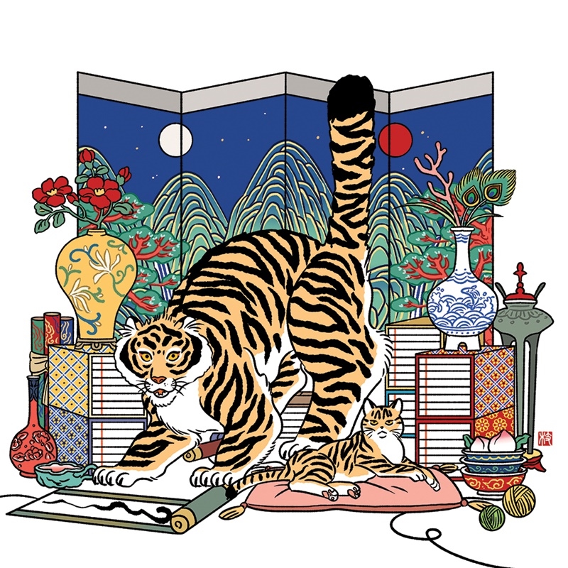 호랑이 그림은 예로부터 새해를 맞아 액을 물리치는 의미로 대문에 붙이거나 서로 주고받으며 재해를 막기 위해 사용되었다. 그중에서도 널리 알려진 <송하맹호도>와 <호작도>는 빼놓을 수 없는 대표적인 호랑이 그림일 것이다. 귀엽지만 누구보다 용맹한 반려묘 춘식이와 하식이의 모습을 빌려 호랑이의 모습을 나타냄으로써, 작가의 집을 든든히 수호하는 벽사의 모습을 담아냈다. (인스타그램 @chunhasik)