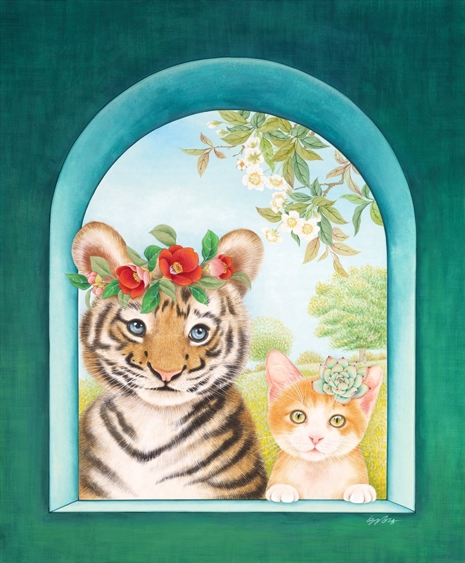 호랑이 하면 떠오르는 건 사납고 무서운 모습이겠지만, 아기 호랑이를 보면 그 생각이 달라진다. 초롱초롱한 눈망울과 귀여운 모습이 고양이와 비슷함을 느끼게 된다. 무서운 줄로만 알았던 호랑이의 대반전과, 언제나 귀엽고 사랑스러운 고양이를 아기 시절의 모습으로 표현해 보았다.