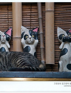 눈 가리고 3년, 귀 막고 3년, 입 막고 3년. 옛날 시집살이하는 며느리가 그랬다지요? 요즘에는 그런 자세를 요구하는 집도 거의 없겠지만요. 맨 처음 저런 조각을 본 것은 한 헌책방에서였는데 그땐 원숭이 세 마리가 저 자세를 취하고 있었답니다. 동남아 어딘가에서 만들었음직한 분위기의 조각이었죠. 몇 년의 세월이 흘러, 일본의 고양이 카페 앞에서 저 3인방을 만나게 될 줄은 몰랐습니다. 너희는 어디서 왔니? 물어보고 싶었지만, 겁에 질린 표정의 고양이 3인방은 아무 말이 없었습니다. '눈 가리고 3년, 귀 막고 3년, 입 막고 3년'의 자세는 약자로 취급받는 이들, 혹은 약자의 상황에 공감하는 이들이 자신도 모르게 취하는 방어 자세가 아닌가 싶기도 합니다. 나는 아무 힘이 없는데, 눈에 보이기는 하니 마..
