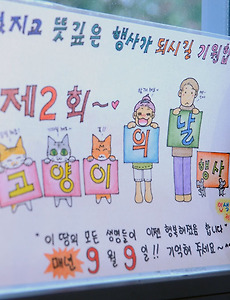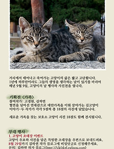 제2회 고양이의 날, 길고양이 치료기금 후원 완료 알라딘 교보문고 예스24 인터파크9월 9일 '제2회 고양이의 날'을 맞이해, 9월 4일부터 11일까지 열린 고양이의 날 기념전 및 행사가 많은 분들의 참여 속에 잘 끝났습니다.한국고양이보호협회의 길고양이 치료기금 후원을 위해 진행했던 소품판매에서 액자와 소품 제작비, 배송비 등을 제한 수익금 865,000원을 후원계좌로 송금했습니다. 길고양이에 대한 전시와 행사가, 동물보호 현장에서 활동하는 분들께 조금이나마 도움되길 바랍니다. 다음넷 '나도 만화가'에 고양이 웹툰 '인색묘'를 연재 중인 권양 님이 보내주신 축하그림^^ 고맙습니다.2009년 9월 9일 처음 시작한 고양이의 날, 올해로 두 번째 전시와 행사를 마무리하고 보니 많은 생각이 듭니다.전시에 오신 분들이 길고양이 사진을 보며 함께 행복해하고 .. 2010. 9. 17. 보호소 고양이 사진, 새 가족을 찾아가요 1300K , 텐바이텐, 바보사랑 판매중(사이트명 클릭하면 이동합니다^ㅅ^) '제2회 고양이의 날' 전시 마지막 날에는 보호소 고양이들의 사진을 추첨하여 보내드리는 행사가 열렸습니다. 직접 입양하지는 못하더라도, 새로운 가족을 기다리는 고양이들을 마음으로 안아주십사 하는 뜻에서 마련한 전시와 추첨행사였는데요. 저마다 사연을 지닌 18마리 고양이의 이름이 각각 적힌 추첨함에 연락처를 넣어 응모하면 마지막 날 오후 5시에 추첨하는 행사였습니다. 18칸의 추첨함을 하나씩 뜯어 당첨자를 발표했지요. 저런 추첨함으로 쓸 상자가 없어서 직접 만드느라 고생했어요;; 휴지 속심 18개를 이어 18칸을 만들고 우드락으로 틀을 만들었지요. 동그란 캣타워에서 젖은 눈망울을 빛내던 한별이 사진도 많은 분이 응모하셨지만, 의외.. 2010. 9. 13. 제2회 고양이의 날 행사를 준비합니다(9.4~9.11) 1300K , 텐바이텐에서 판매중(사이트명 클릭하면 이동합니다^ㅅ^) ♦ 9월 9일 ‘고양이의 날’에 대하여 거리에서 태어나고 죽는 고양이의 삶은 짧고 고단합니다. 1년에 하루만이라도 그들의 생명을 생각하는 날이 있길 바라며, 매년 9월 9일 고양이의 날 행사를 엽니다. 고양이를 요물로 여겨 ‘고양이 목숨은 아홉 개’라 말하는 대신, 그 숫자만큼 질기고 강한 생명력으로 살아남길 기원하는 ‘아홉 구’(九), 그들이 아프지 않고 오래오래 주어진 삶을 누릴 수 있길 기원하는 ‘오랠 구’(久)의 음을 따서 정한 날짜입니다. 고양이의 날 행사와 전시를 통해, 길 위의 생명에 대한 연민과 관심이 확산되기를 바랍니다. ♦ 주요 전시 및 행사 1. 기획전 기획전은 매년 한 가지 주제를 정해, 기획자와 초대작가가 함께 .. 2010. 8. 20. 9월 9일 '제1회 한국고양이의 날' 축제에 초대합니다 9월 9일, 홍대앞 쌀집고양이에서 제1회 '한국고양이의 날' 행사를 엽니다. '고양이 목숨은 아홉 개'란 말이 무색할만큼, 거리에서 태어나고 죽는 고양이들의 삶은 턱없이 짧고 쓸쓸합니다. 1년에 하루만이라도, 우리 곁의 고양이를 따뜻한 눈으로 돌아보는 시간을 마련하려 합니다. 고양이의 질긴 생명력을 뜻하는 아홉 구(九)와 고양이가 주어진 시간 ㄷ오안 오래 살아남기를 바라는 오랠 구(久)의 음을 따서, 9월 9일을 '고양이의 생명을 생각하는 날'로 삼고 매년 이맘때 고양이를 위한 행사와 전시를 열기로 했습니다. 날짜를 정하는 것은, 이 행사를 매년 이어가겠다는 다짐이기도 합니다. '고양이의 날'이라고 해서 거창한 기념일로 생각하기보다는, 고양이에게 관심이 있고, 고양이와 함께 더불어 행복한 삶을 만들어가고.. 2009. 9. 9. 이전 1 다음